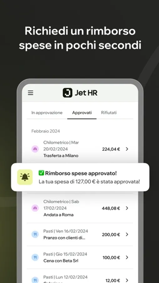 Rimborsi spese in un tap Con l’app di Jet HR puoi registrare le tue spese in modo veloce e senza errori: inserisci l'importo e scatta una foto dello scontrino o della ricevuta. In più, se viaggi con la tua auto, puoi anche calcolare il rimborso chilometrico direttamente dall'app.