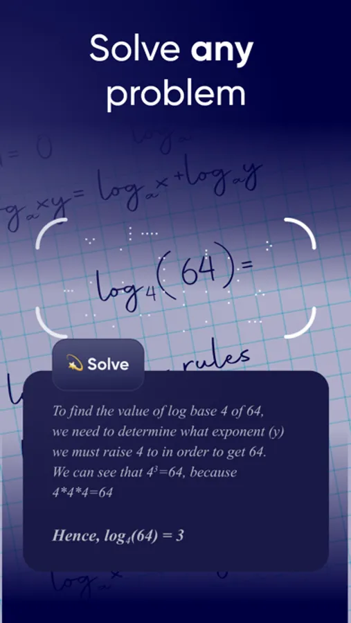 • Solve problems in seconds - get help with homework, math problems & more using your camera