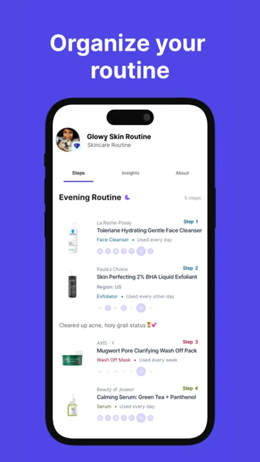 Skincare is a journey. With SkinSort, you can track your routine and log your skin's progress. Organize all your cosmetics to get a clear picture of your routine, so you can focus on reaching your skin goals. Some products should not be used together - we’ll let you know about potential incompatibilities in your routine. Check in with your skin daily by logging the products you use. Get trends and insights over time, so you can become an expert on your own skin.