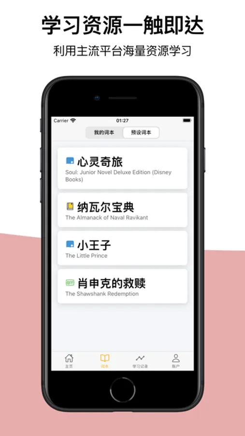在用户自主导入学习资源之外,我们还预设了来自微信读书、爱奇艺、腾讯视频等主流平台的词本,让你直接利用现有平台的海量资源进行学习。