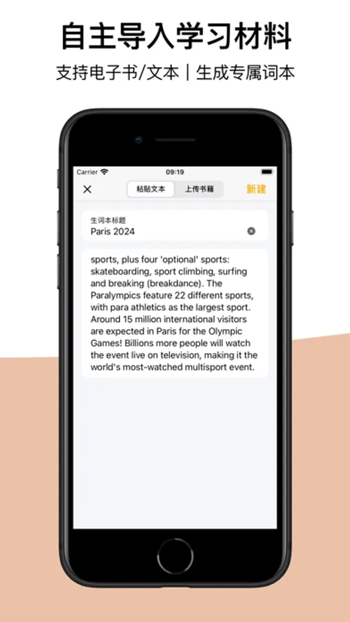 1. 自主生成学习列表。导入英文电子书、影视剧字幕或其他文字文本,自主创建专属于你的学习词本,app将基于原文内容自动生成带原文例句摘抄的学习词库。