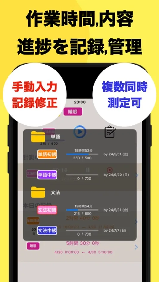 記録の分類:記録された時間はスタート時間、ストップ時間、任意の日付で分類できます。深夜に勉強や仕事を終えても、任意の日付に記録可能。