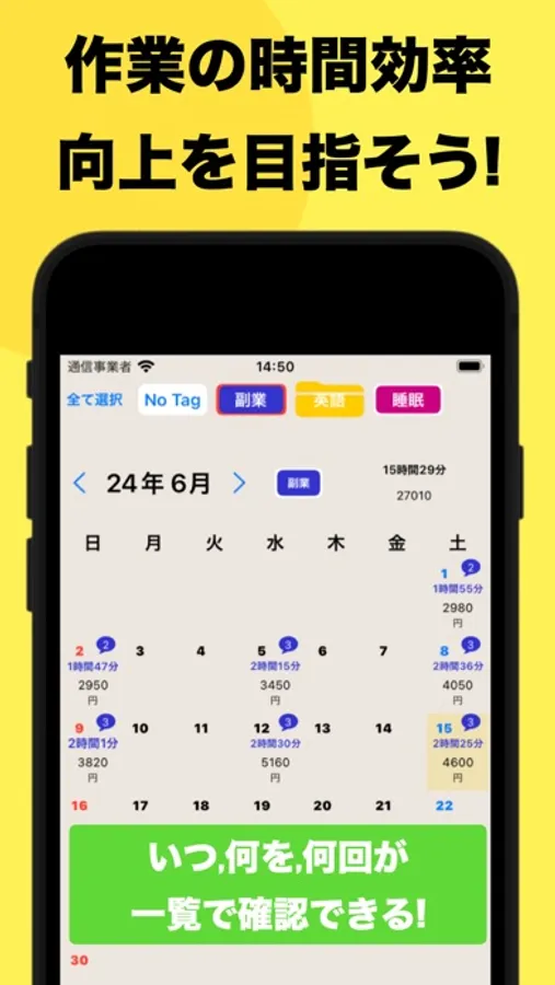 マルチタスクの時間計測、メモ、作業内容の記録:記録を日付(カレンダー)および進捗ゲージで管理。時間とメモ、作業内容は測定前、測定中、測定後のいつでも作成・修正が可能です。