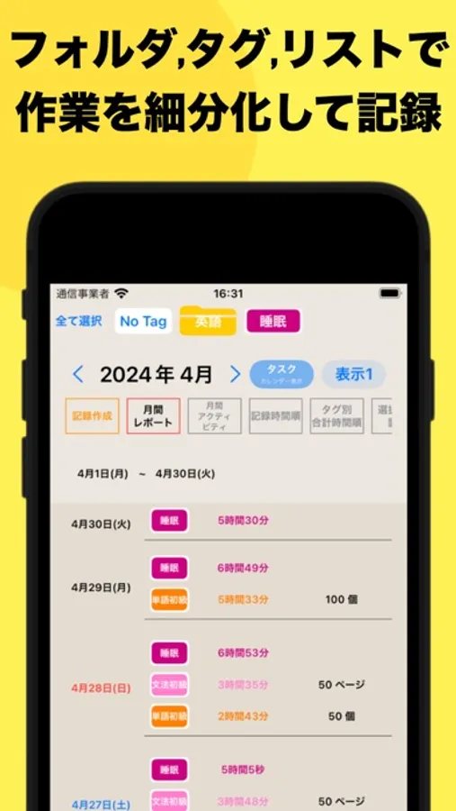 タグ管理:測定された時間と作業記録はタグで分類。タグはフォルダで管理でき、作成・修正もいつでも可能。同じタグで記録されたデータを多角的に分析できます。ただし、タグを削除するとそのタグに関連する記録も削除され、noTagとして分類されます。