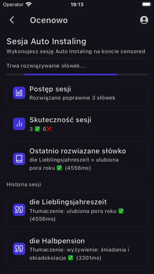 - śledzenie aktualnego postępu sesji, dostęp do każdego wpisanego słówka i każdej definicji