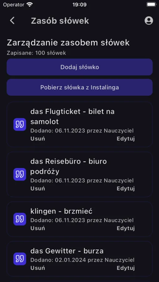- zasób słówek, sprawdzaj wszystkie słówka, jakie są dostępne dla Twojego konta i ucz się z nich na bieżąco