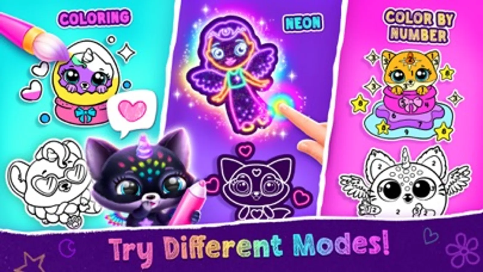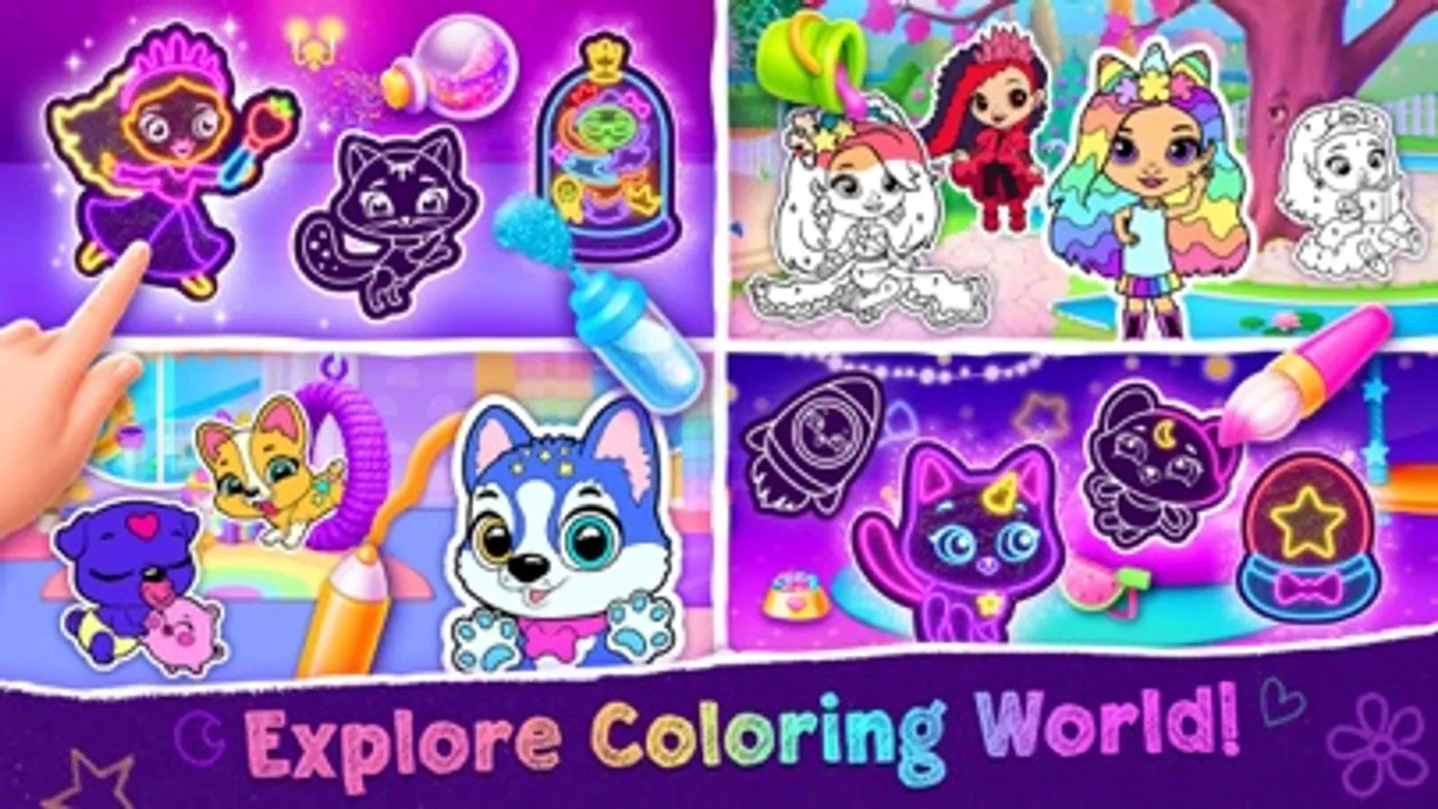 It's time for drawing fun! Unleash your creativity with brushes, markers, pencils, color spray & glitter glue in this fun coloring game! Bring Princesses, cuddly pets, or the cutest pom pom creatures to life with a burst of neon colors & your favorite patterns!