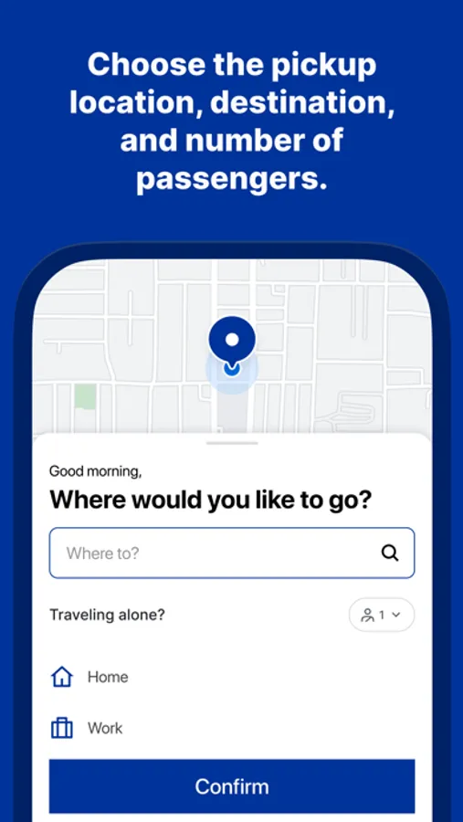 - Book a ride by setting your pickup and dropoff addresses and indicating if you’re riding with any additional passengers.