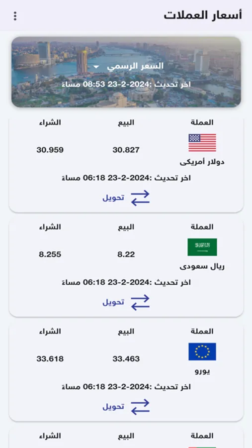 The Egypt currency rates application provides instant information on currency rates in the Egyptian market. The application allows users to follow updates on major currencies such as the US dollar, the euro, and others based on official rates, in addition to market rates.
