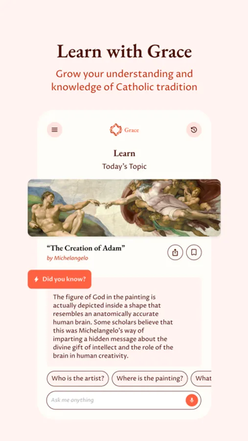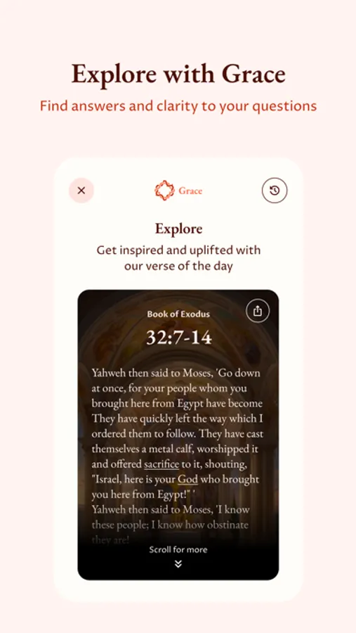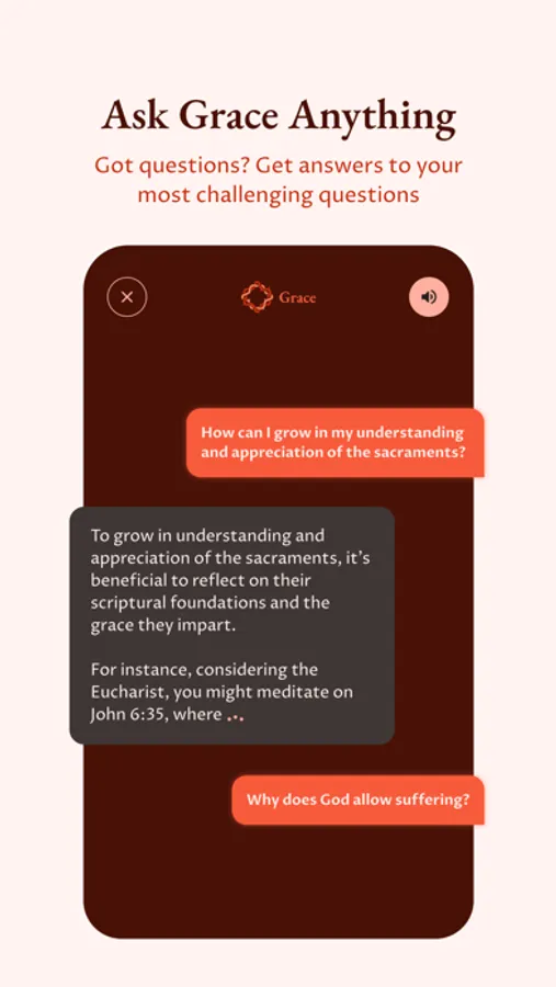 Transform your Catholic faith with Grace, your AI spiritual companion. Get personalized Catholic prayers, daily Bible verses, and spiritual guidance tailored to your unique faith journey. Whether deepening prayer life or seeking wisdom for life's challenges, Grace provides authentic Catholic teaching and support.