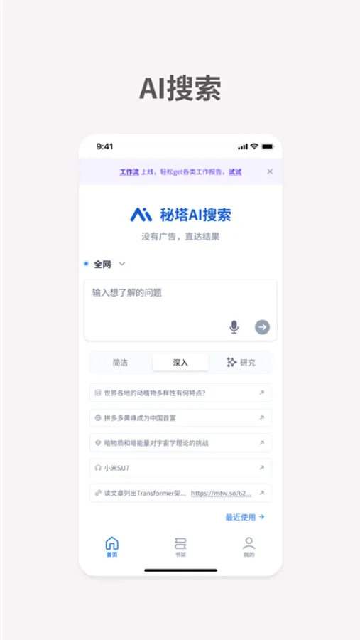 上班族(运营、市场、销售、金融、自媒体等):强大的搜索及整合能力,助力用户快速检索到有效信息,提升工作效率;“工作流”可助你更快完成重复性研究