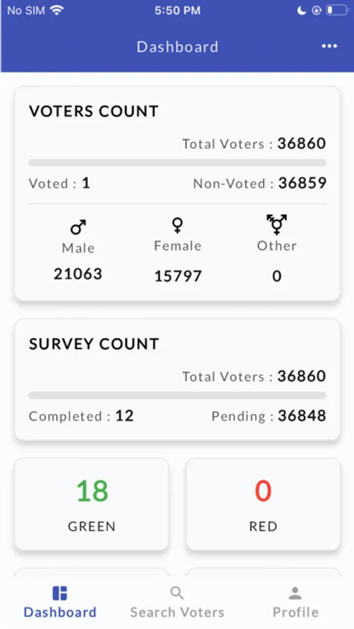 2. A dashboard that shows the status of voted and non-voted, survey completion of that ward, male, female, and other voters in the ward.