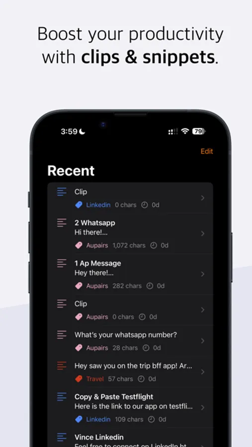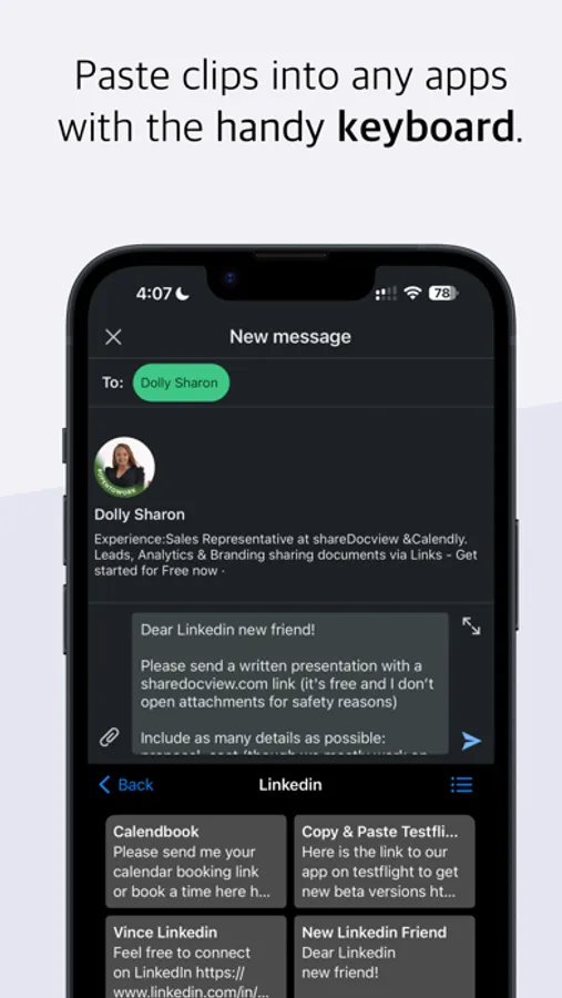Boost your productivity with reusable text clips, that you can easily paste into any app, chat, or e-mail.