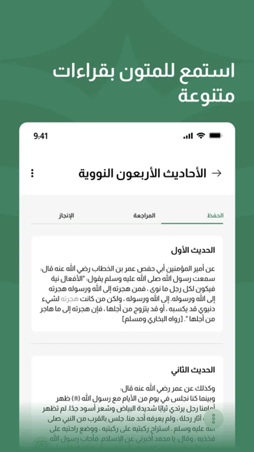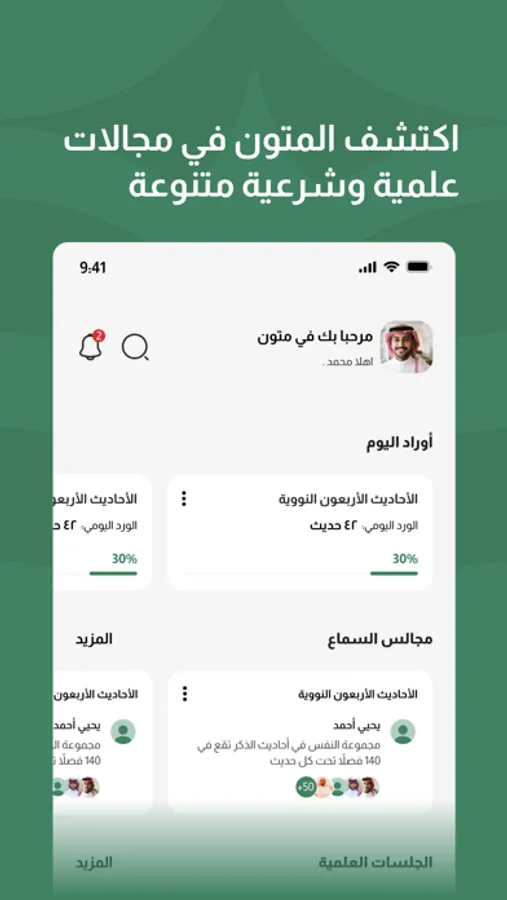 متون: احضر مجالس السماع من الحرم المدني، تدارس المتون، احفظها بخطط يومية، واستخدم الذكاء الصناعي للتسميع. احصل على شارات وشهادات الآن!