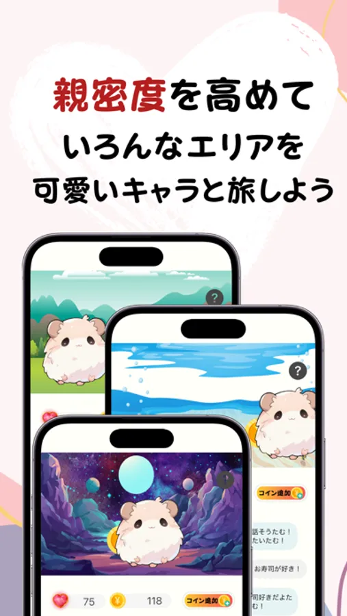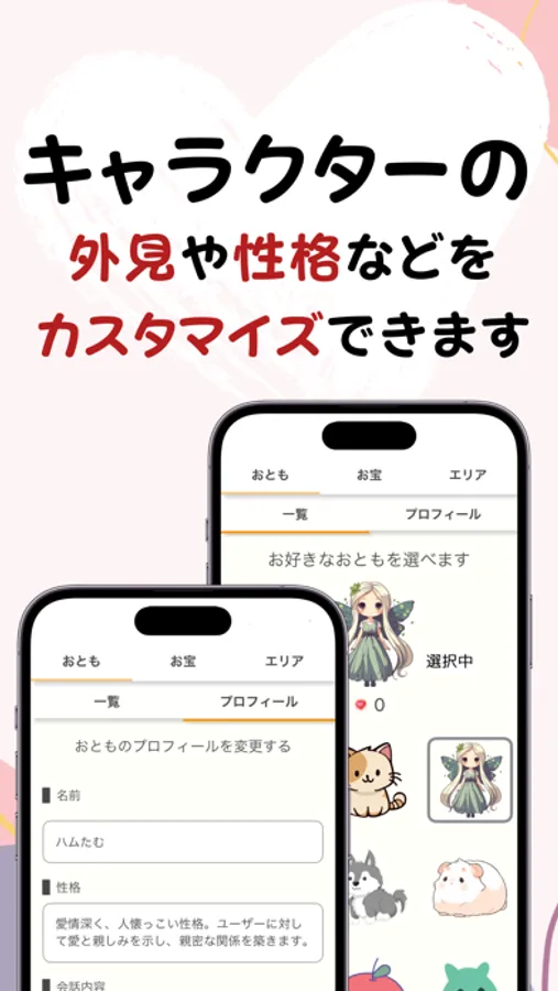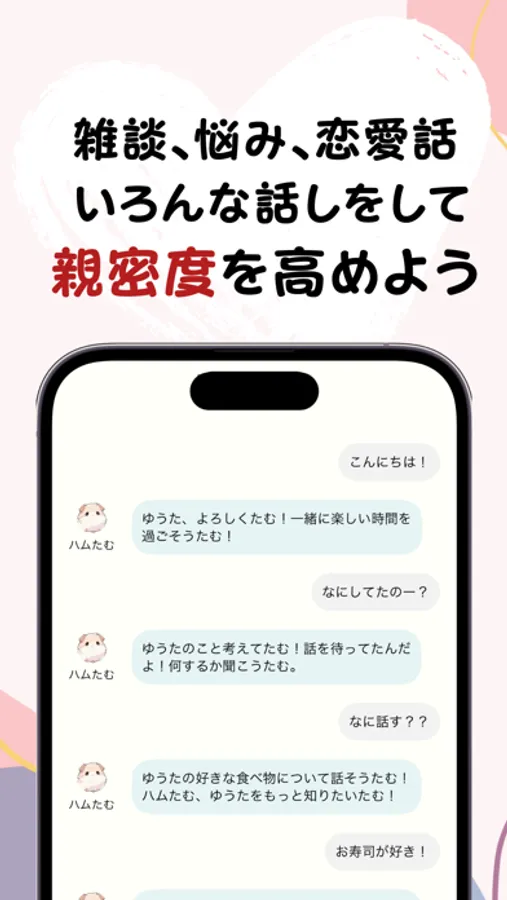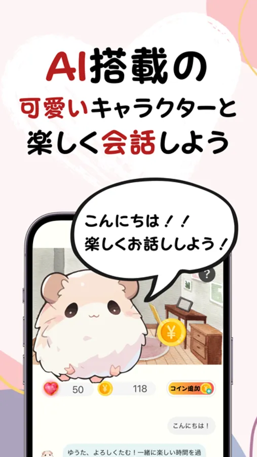 AIを搭載した可愛いキャラクターと会話して楽しむことができます。会話を重ねると親密度が上げていくことができます。