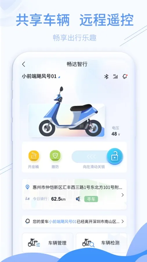 畅达智行APP是一款创新的移动应用程序,为电动骑行者提供便利的服务。它具有一系列功能,包括车辆管理、行程记录、电子围栏和共享钥匙等等。通过本App可以快速高效地完成一系列电动车相关操作,实用且方便。