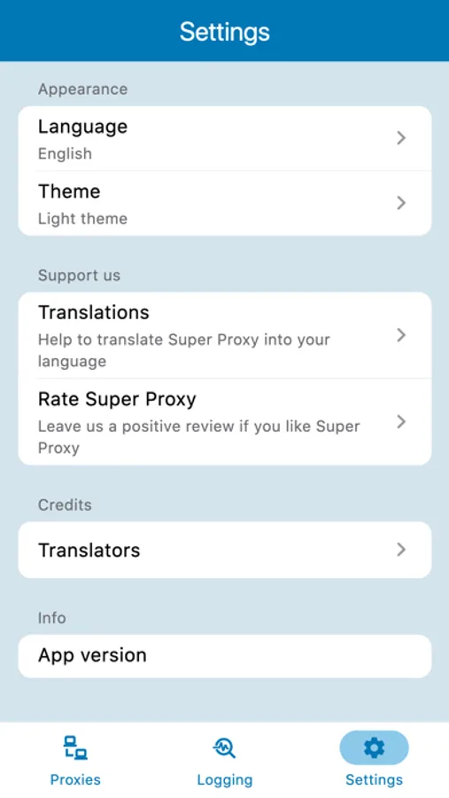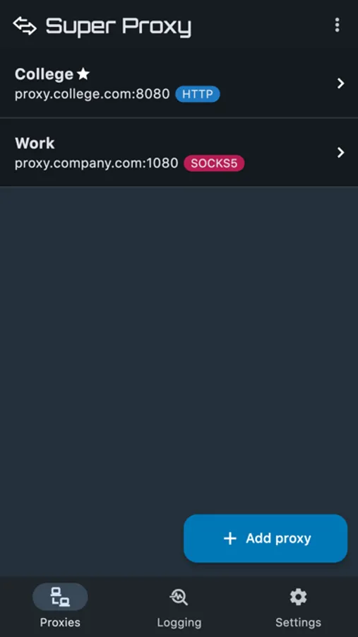 Super Proxy tunnnels all your apps through an HTTP or SOCKS5 proxy server. This enables you to access the internet in every app within your company or college network. Alternatively you can use a public proxy server for example to bypass restrictions of your ISP.