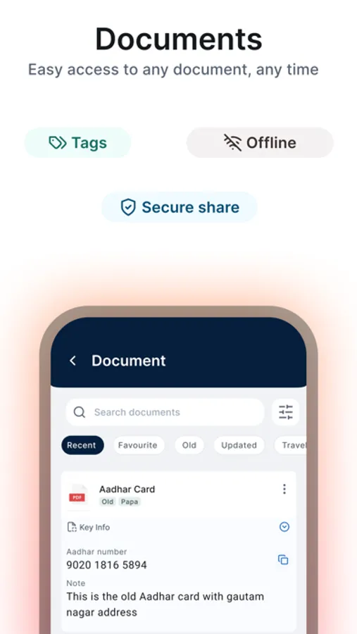 Organize, store, and share important family documents with offline access. Tag files for quick retrieval and securely share PDFs and images with your family when needed.