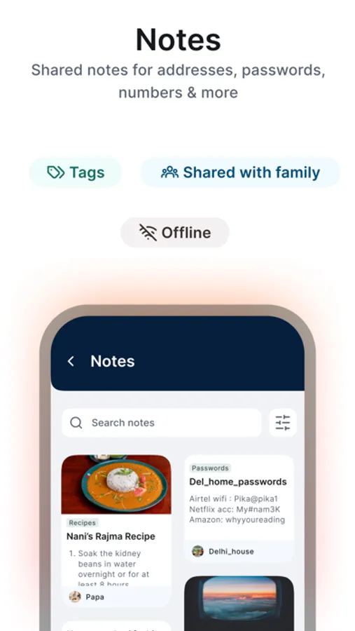 Save and share recipes, health notes, travel plans, and more in shared notes that your family can access anytime, even offline.