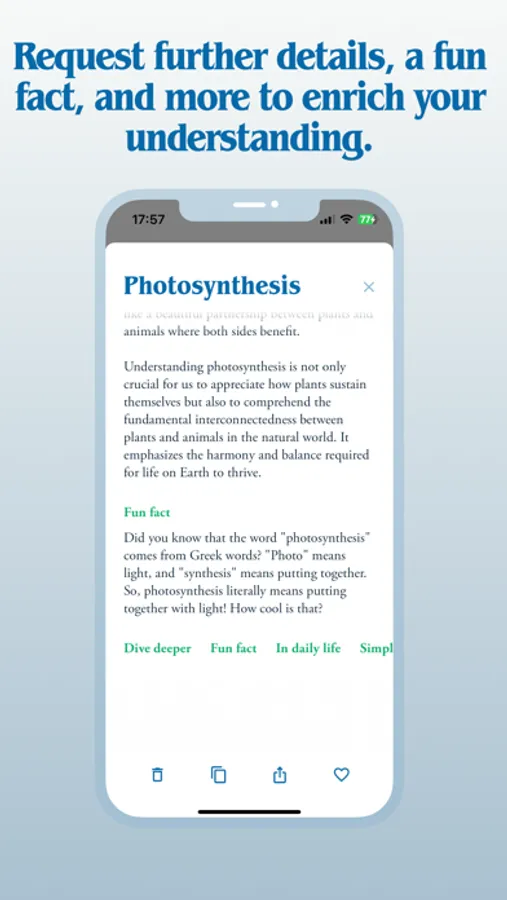 - Share the joy of learning: Discover something amazing? Easily share it with friends and spark their curiosity.