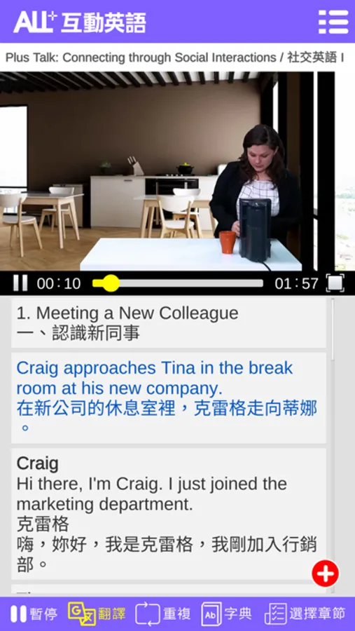 很多人學了很多年英語,但真正要使用時卻又提不起勇氣,變成滿腦子英語卻不是滿嘴英語,《ALL+互動英語》針對聽說讀寫設計實用功能,所有會話場景請外籍演員真人實景演出,讓您置身於最真實的學習情境,提供最佳的實際演練環境,可隨時練習,效果再加倍,讓您隨時隨地英語脫口而出。