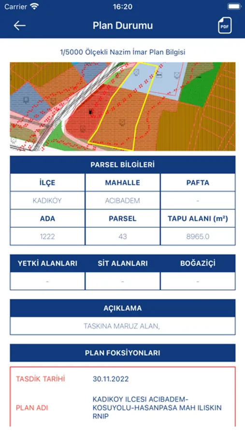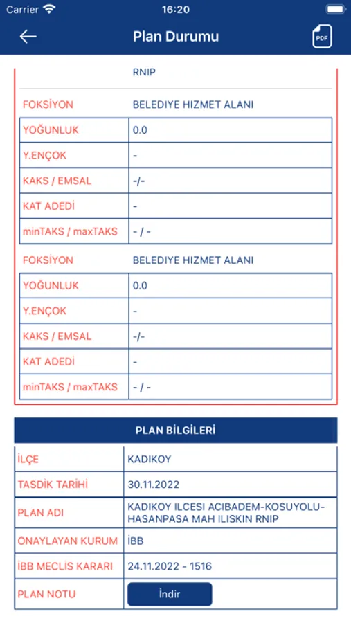 • Sorgulanan parsele ilişkin plan notu indirilebilir.
