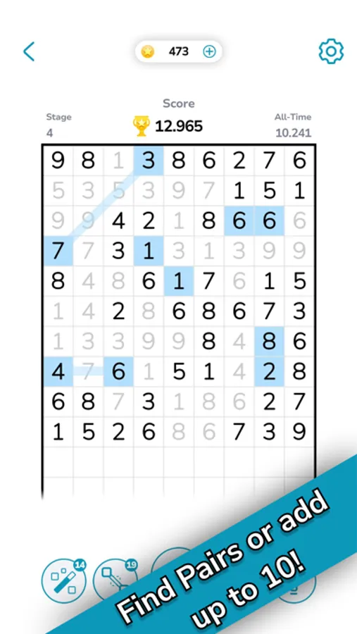 * Match the numbers on the game board that are the same (6 and 6, 8 and 8) or add up to 10 (7 and 3, 9 and 1). Tap on these numbers to connect them and remove them from the board.