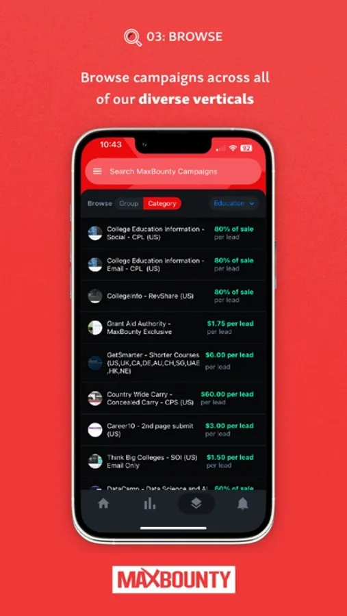 Offer Library: Browse through a vast library of MaxBounty campaigns. Filter over 3000+ campaigns by category, conversion type, OS support and geographic availability.