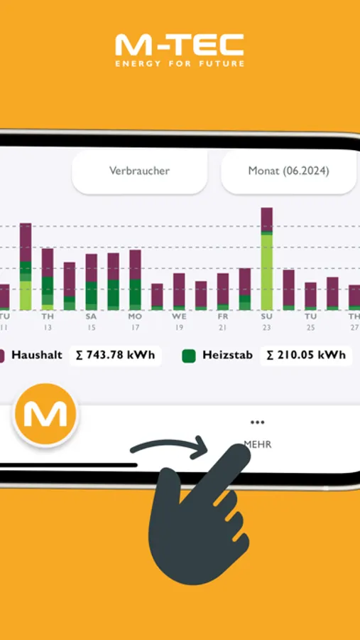 With the new M-TEC E-SMART APP, you can bring M-TEC's comprehensive energy management directly to your smartphone. This innovative application makes all energy flows in your building visible and gives you a detailed overview of the energy you generate and consume, as well as the current status of your M-TEC products. The app allows you to create daily, monthly and annual evaluations of your energy production and consumption so that you always have an overview.
