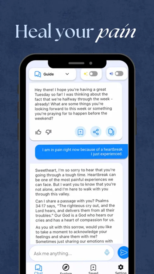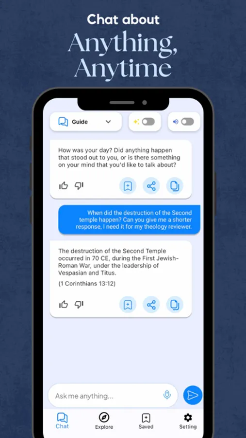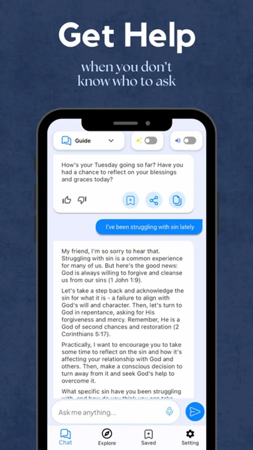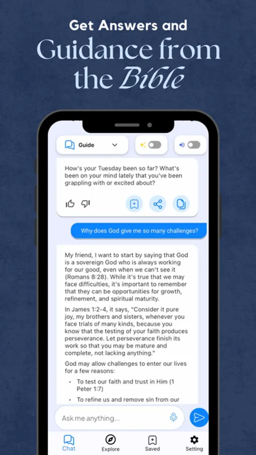 Scripture Study for Every Believer: Whether you're a seasoned Scripture scholar or embarking on your faith journey, Bible Chat provides a universally accessible platform for Scripture study. Enhance your understanding with clear explanations, engaging Scripture discussions, and a vast repository of biblical resources tailored to your learning pace.