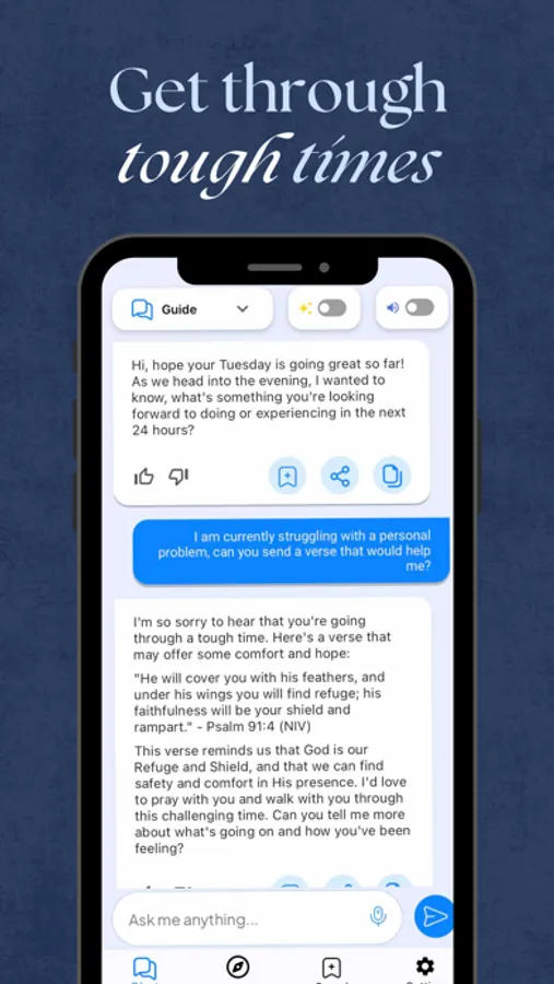 Find Solace and Guidance: During life's challenges or crossroads, discover solace, inspiration, and biblical wisdom through Bible Chat's interactive chat. Receive comforting Scripture verses, uplifting messages, and a connection to God's enduring word.