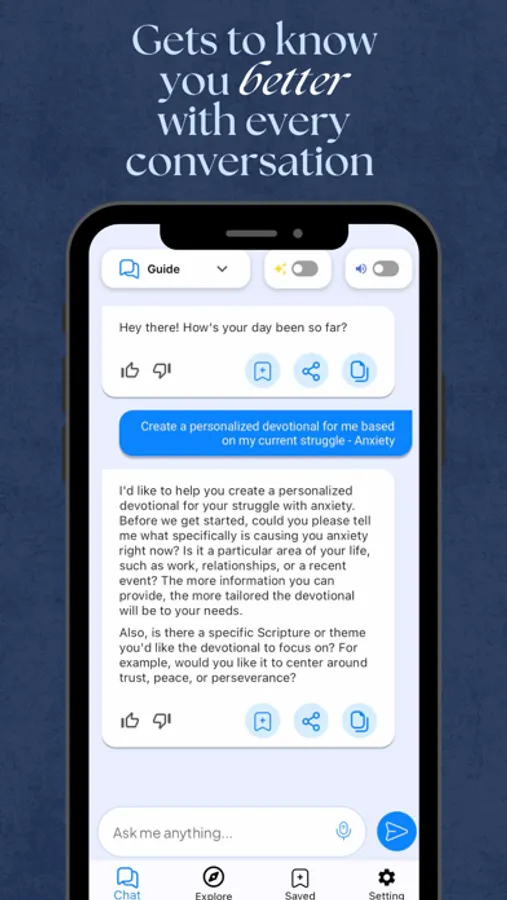 Fuel Your Spiritual Growth: Cultivate profound spiritual growth with personalized tools, resources, and faith-enriching chats. Bible Chat offers customized Scripture memory exercises, inspiring daily devotionals, and a welcoming Christian community designed to nurture your spiritual development.