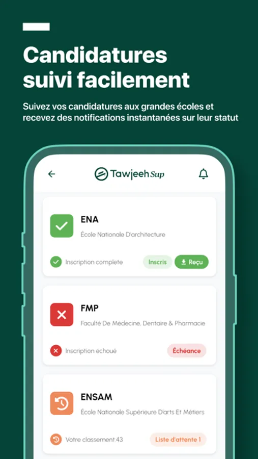 L'équipe Tawjeeh Sup prend en charge le reste, vous permettant de vous concentrer pleinement sur vos études. Grâce à Tawjeeh Sup, ne manquez jamais une date limite, simplifiez votre parcours académique maintenant.