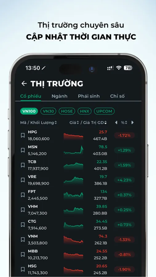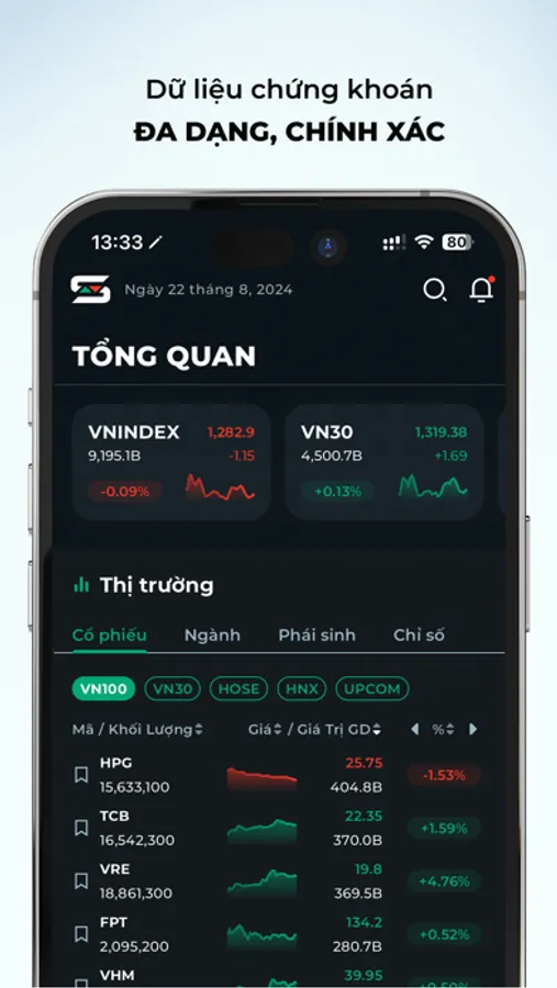 3. Thông tin tổng quan toàn thị trường: Thông tin thị trường được cập nhật theo thời gian thực về các chỉ số, cổ phiếu, trái phiếu,... Chi tiết các mã cổ phiếu, tổng quan các ngành dẫn đầu, dữ liệu phái sinh và chỉ số nổi bật luôn được hiển thị trực quan. Dữ liệu được chọn lọc từ đội ngũ chuyên gia dày dặn kinh nghiệm giúp các nhà đầu tư luôn nắm bắt nhanh các xu hướng của thị trường.