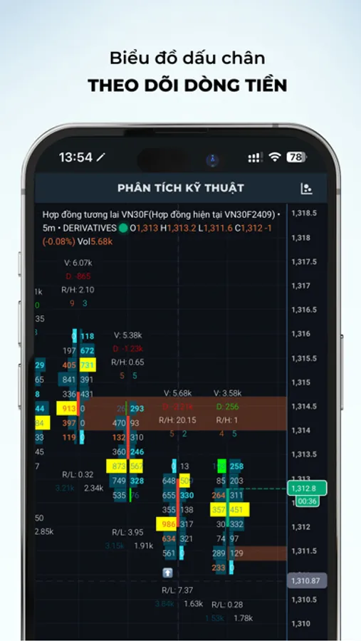 1. Theo dõi dòng tiền trực tiếp trên biểu đồ nến: Biểu đồ nến được tích hợp Footprint Chart là một công cụ phân tích Order Flow (dòng lệnh) mạnh mẽ, giúp người dùng hiểu rõ hơn về tương tác giữa giá cả và khối lượng trên thị trường. Footprint chart cho phép nhà đầu tư nhìn sâu vào bên trong cây nến và xem được toàn bộ khối lượng mua bán chủ động tại từng mức giá cụ thể từ đó hiểu rõ hơn về câu chuyện thị trường muốn kể.