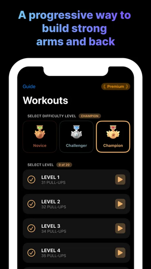 Start your journey with a structured bodyweight training plan. The program is divided into 3 levels – Novice, Challenger, and Champion – each containing 20 sessions. Advance at your own pace and build solid, lasting progress with every workout.