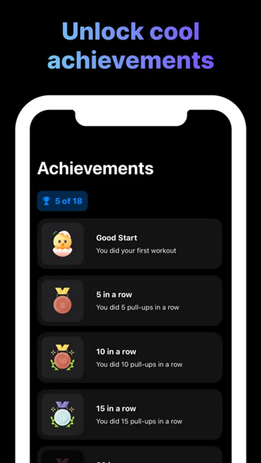 Unlock achievements as you progress through each phase. Track your growth, celebrate milestones, and stay motivated as you get closer to mastering 20 consecutive pull-ups.