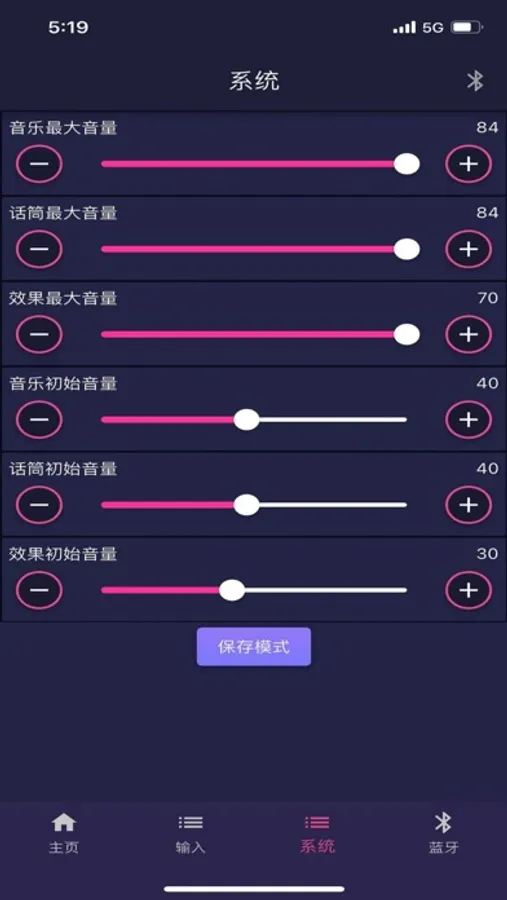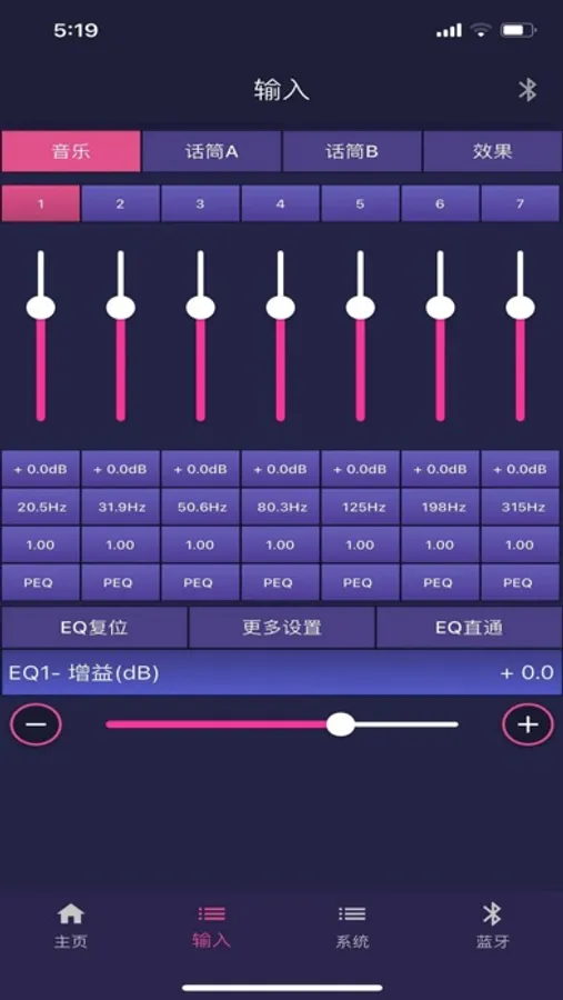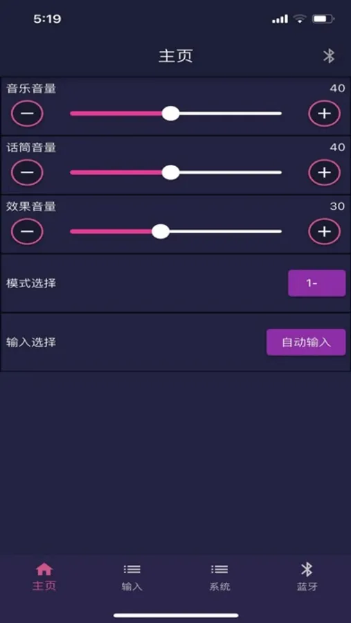手机通过蓝牙连接到相应的设备,可以调节设备参数,比如:音乐音量,麦克风音量,效果音量,音乐EQ,麦克风EQ,回声与混响的参数,输出音量,音频输入源,用户模式等。