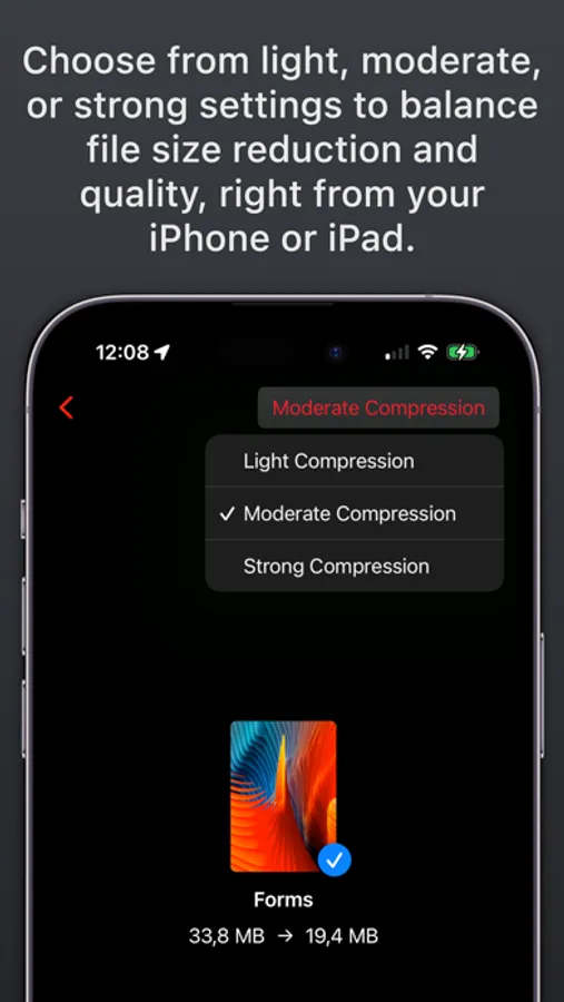 Choose from light, moderate, or strong settings to balance file size reduction and quality, right from your iPhone or iPad.