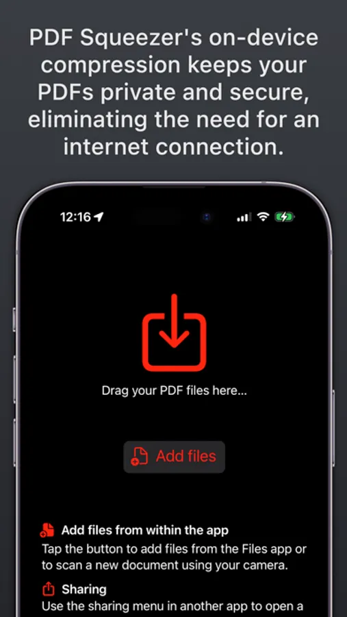PDF Squeezer's on-device compression keeps your PDFs private and secure, eliminating the need for an Internet connection.