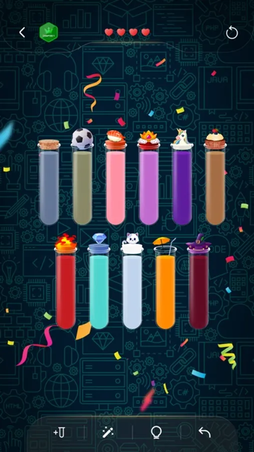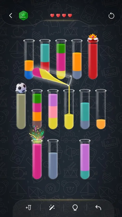 - Tap on a bottle to pour its contents into another one, but remember, you can only pour water of the same color, and each bottle should contain only one color.