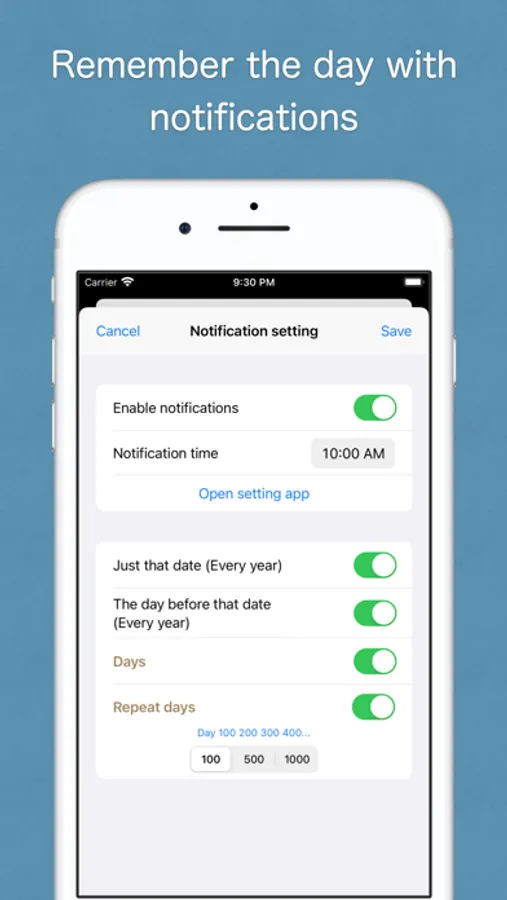 You can set notifications for the number of days you have registered or for a number of well-defined days. (Premium feature)