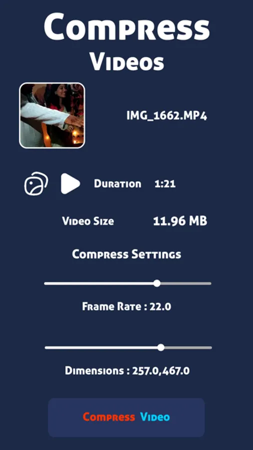Compress videos to your desired file size and easily share it over e-mail, chat, or social platforms. Video Compressor compresses a video by decreasing resolution, video bitrate. Reduces video size, shrink video, save and clear device's storage space. Trim your video with ease. Extract mp3 audio from video. Add text or image to videos.