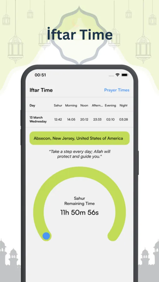 - Sahur and Iftar Times: View the remaining time along with daily sahur and iftar times. Don't miss time with alarm settings.