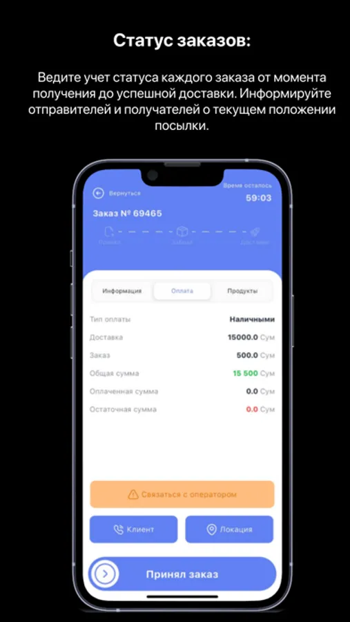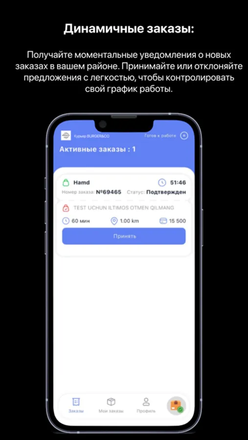 Принятие Заказов на Доставку: Получайте новые заказы прямо в приложении. Вы можете просматривать детали доставки и принимать заказы, которые вам подходят.