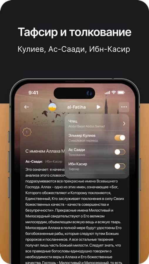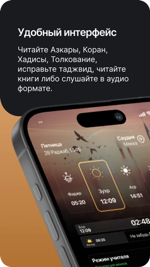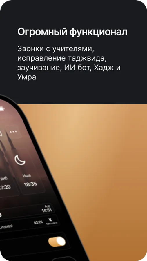 Коран, азкары, добавление своих азкаров, времена намазов, кибла, толкование корана, чтецы, онлайн звонки с преподавателями прямо с приложения, исправление таджвида, заучивание корана, гид Хадж/Умра, часто задаваемые вопросы и ответы на них, поиск ответов в реальном времени через бота, библиотека книг и аудио книги, Хадисы, дуа и зикры, имена Аллаха и их толкования, заметки.