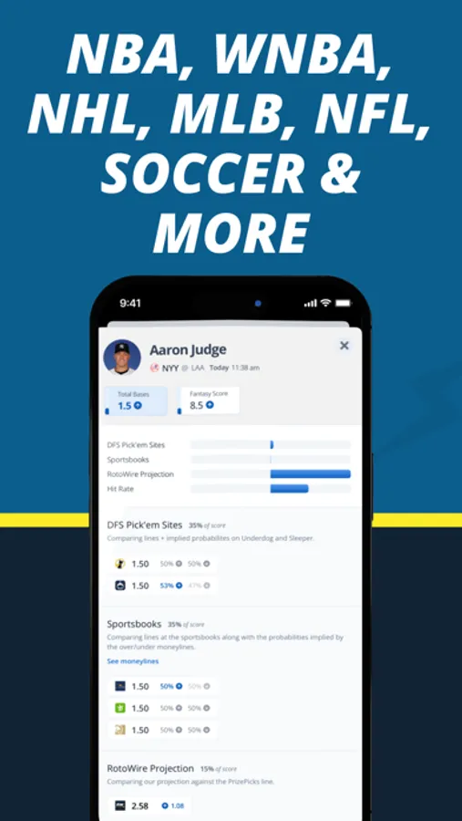 We combine RotoWire’s proven player projections with data from more than nine trusted sources and advanced analytics that quietly leverage AI modeling. The result is a cleaner, sharper way to identify value in player projections across major sportsbooks and DFS pick’em sites.