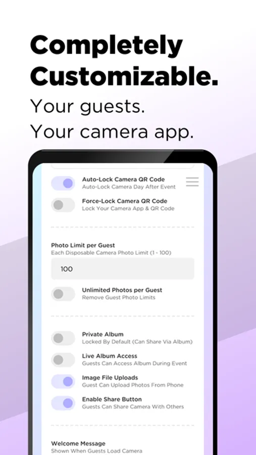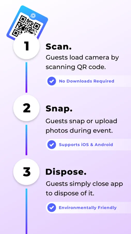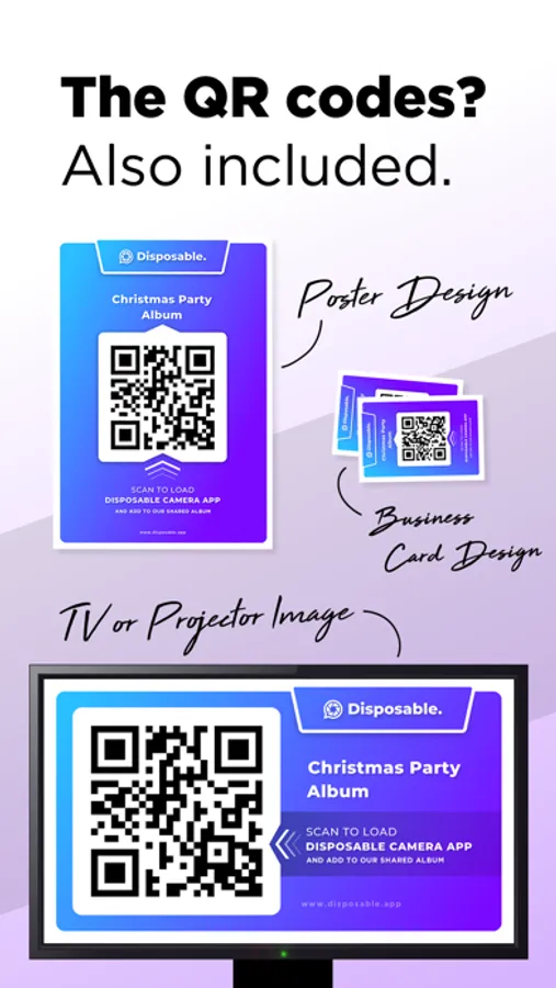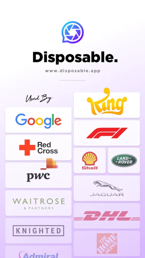 Note: This app allows you to create disposable camera apps which are separate from this app, running as mobile web apps on www.disposable.app, meaning guests do not need to download or install any apps to use your event camera, nor are they required to create accounts to use your event camera apps. Ease of use for event guests is our first priority.