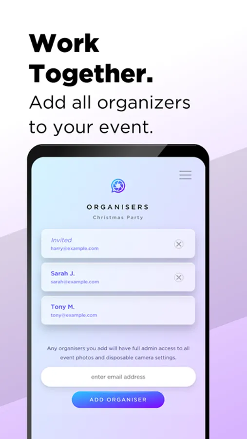 Brought to you by www.disposable.app, the original disposable camera app for events, weddings, parties and more allows you to create unlimited event camera apps for your guests to capture all their photos in one event album.