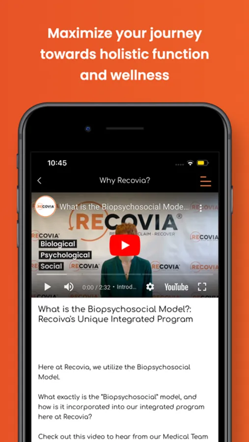 Whatever type of pain you’re dealing with (physical, mental, or both) and whatever behavioral changes you are looking to make, our app maximizes your Recovia experience to restore your overall function. Get the help you never knew existed!